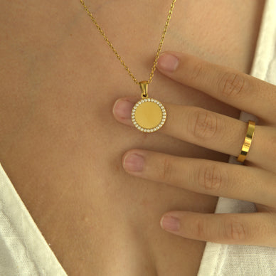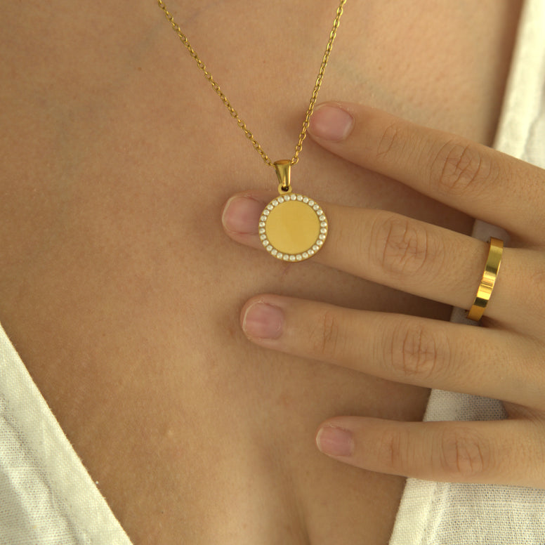 Featuring our luminous circle pendant surrounded by delicate stones and paired with the sleek Glow Band, this set adds effortless warmth to every look.
